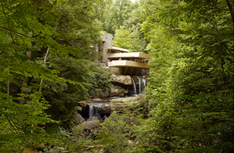 A well-known example of organic architecture is Fallingwater, (Above) the residence Wright designed for the Kaufmann family in rural Pennsylvania. Wright had many choices to locate a home on this large site but chose to place the home directly over the waterfall and creek creating a close, yet noisy dialog with the rushing water and the steep site. The horizontal striations of stone masonry with daring cantilevers of colored beige concrete blend with native rock outcroppings and the wooded environment.